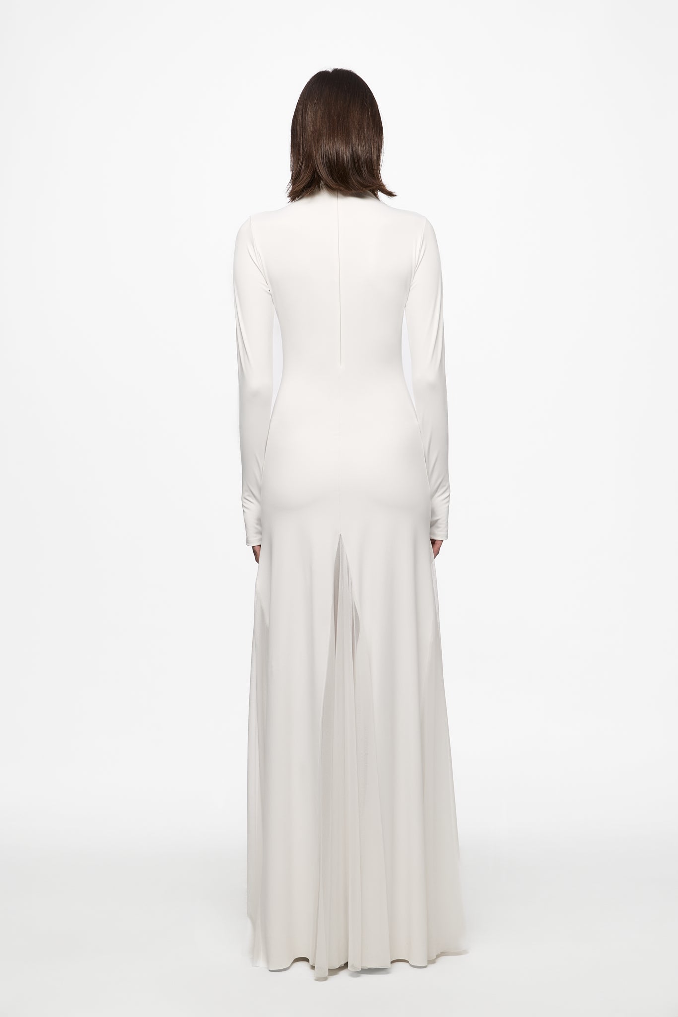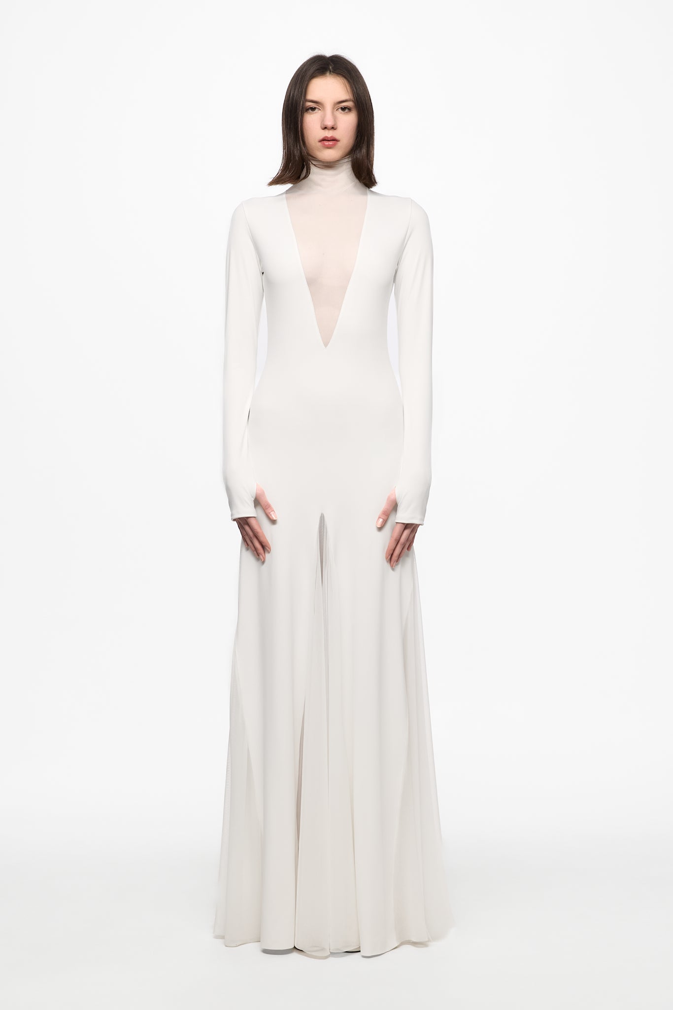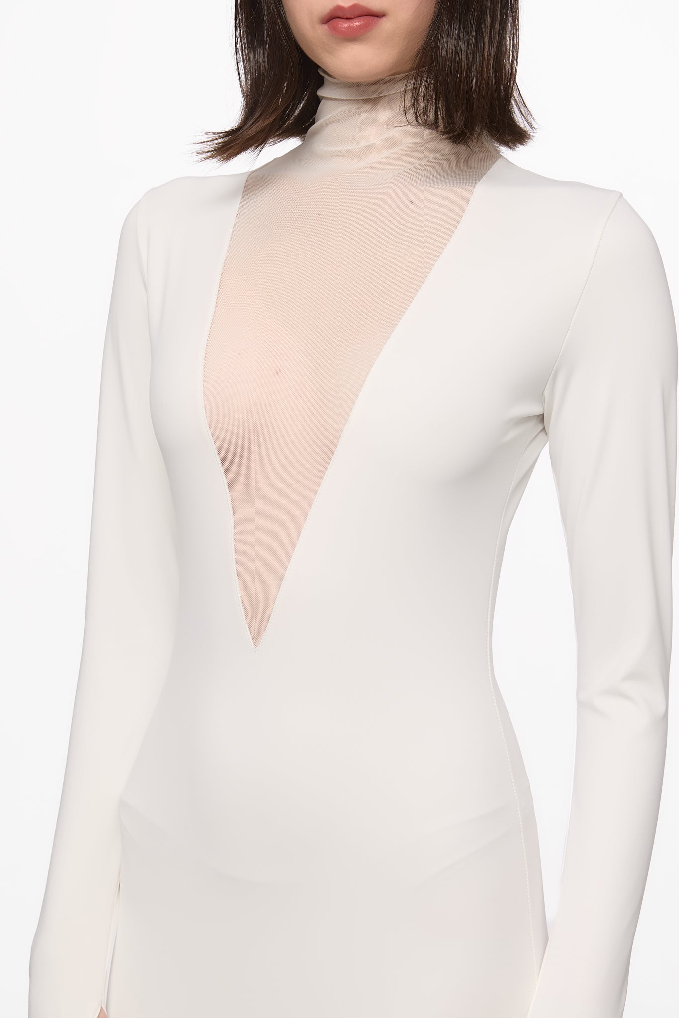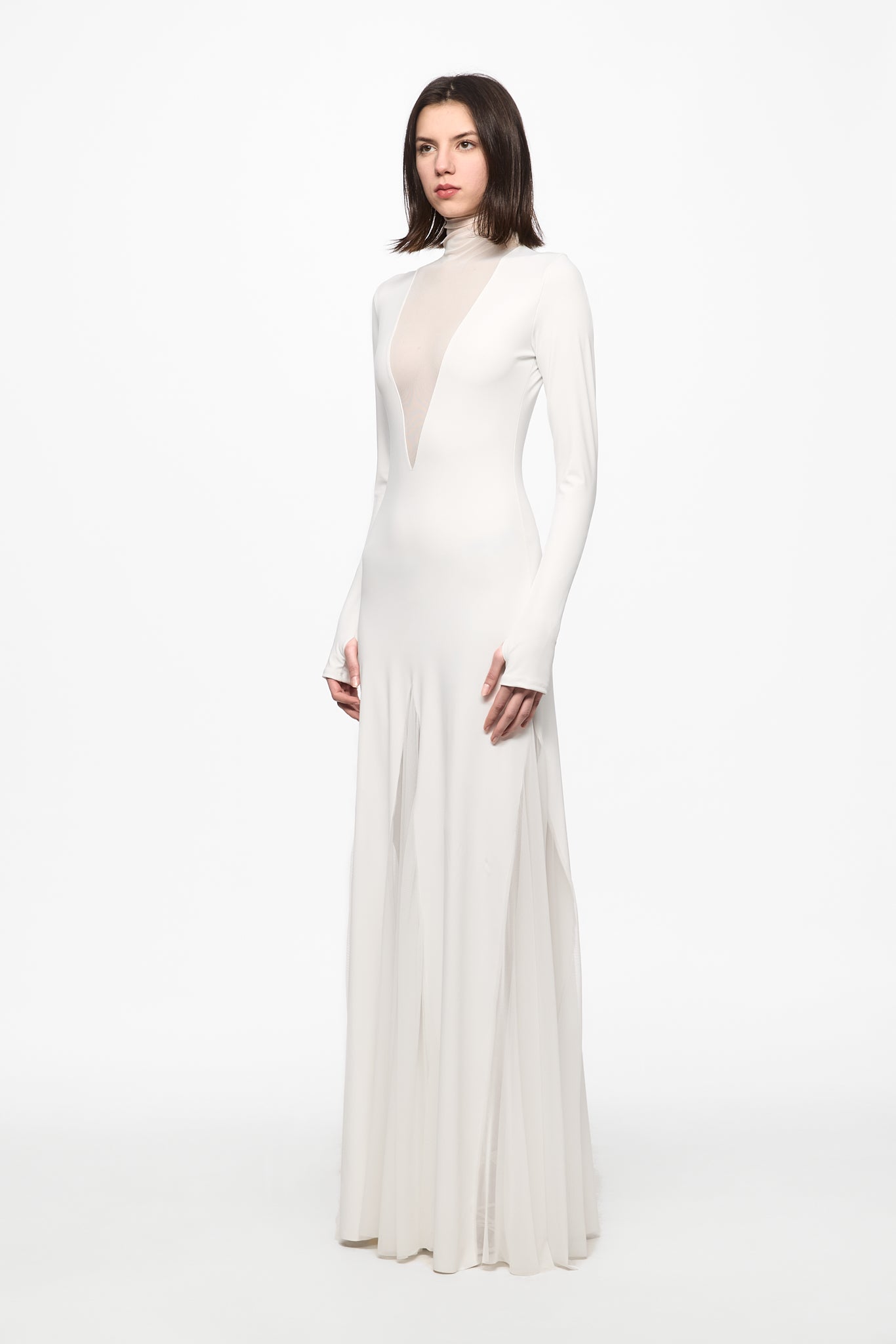Turtleneck long dress with big triangles tulle insertions.