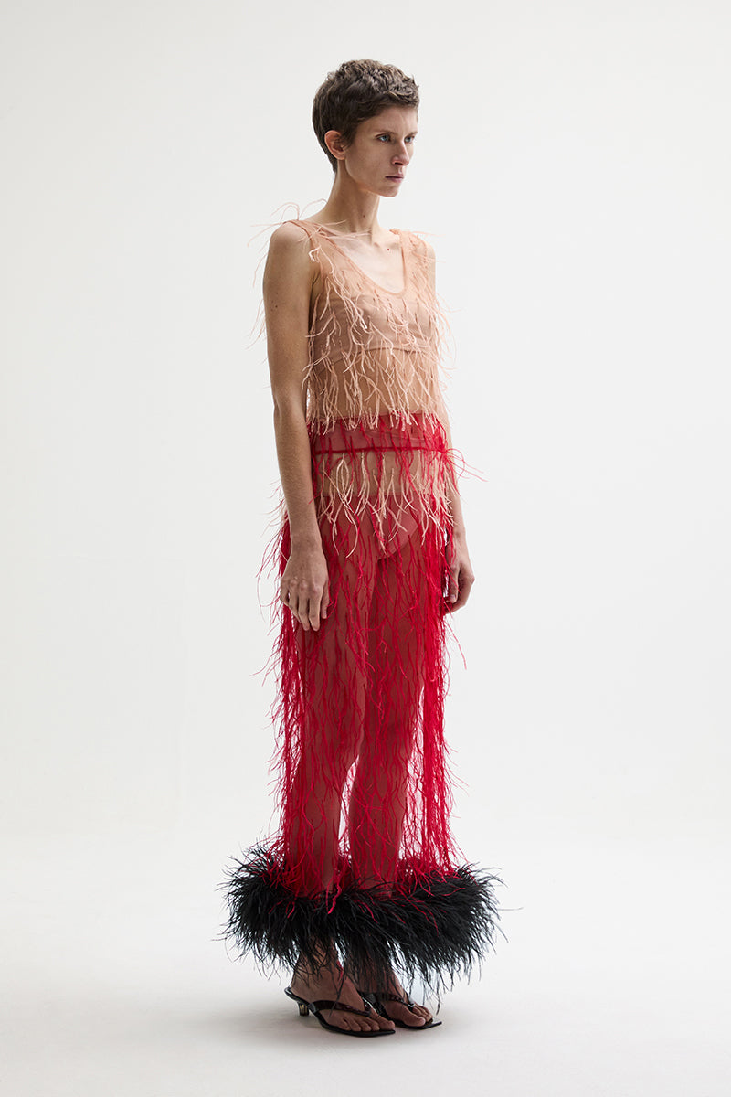 Midi color block sleeveless dress made of nude and red tulle with feather applique.