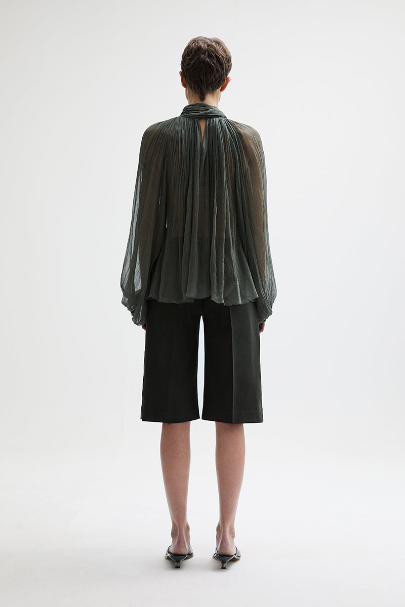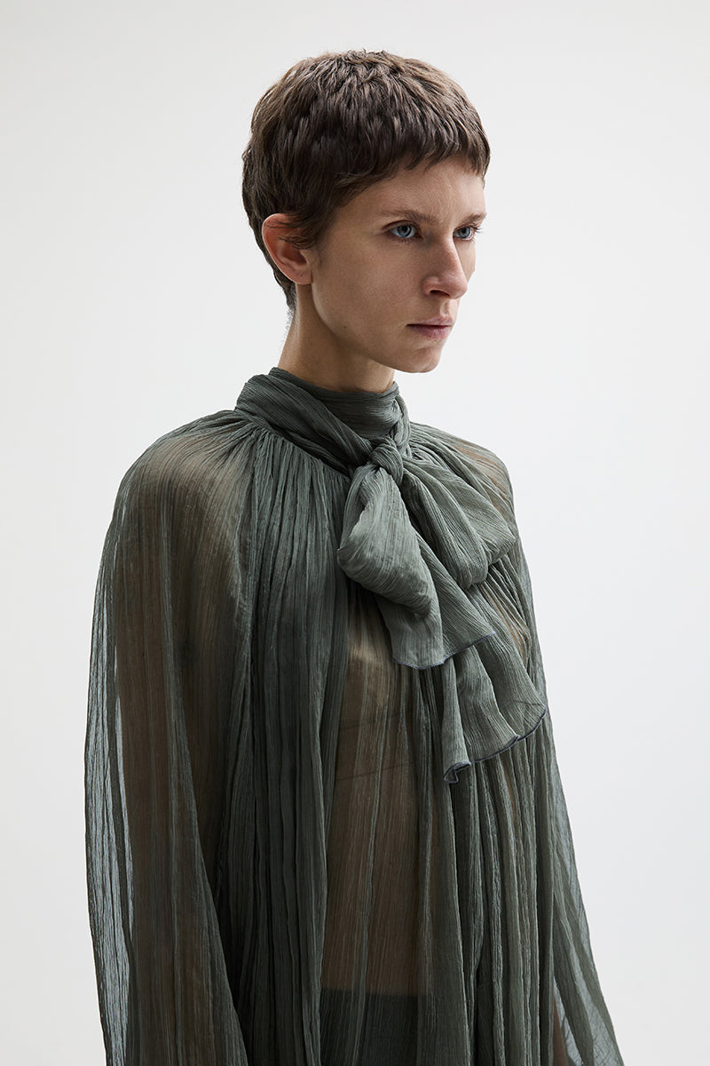 Silk chiffon shirt with wide sleeves and attached scarf.