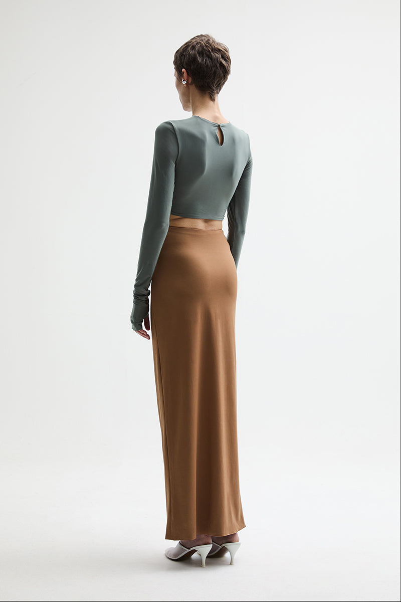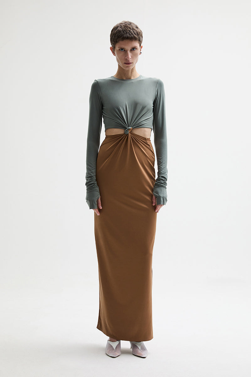 Midi dress with long sleeves and knot detail made of soft camel and stone grey jersey.