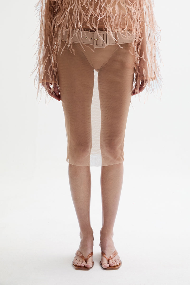 Pencil shirt made of two layers of nude tule. Detachable belt included.